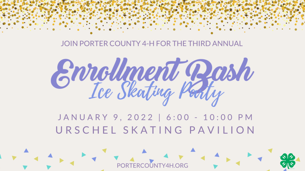 On Sunday, January 9th from 6:00-10:00 p.m. we will host our Third Annual Enrollment Bash at the Urschel Pavilion skating rink in downtown Valparaiso! Porter County 4-H enrollment is open through January 15th, so why not celebrate enrollment with an open skate at the pavilion!?