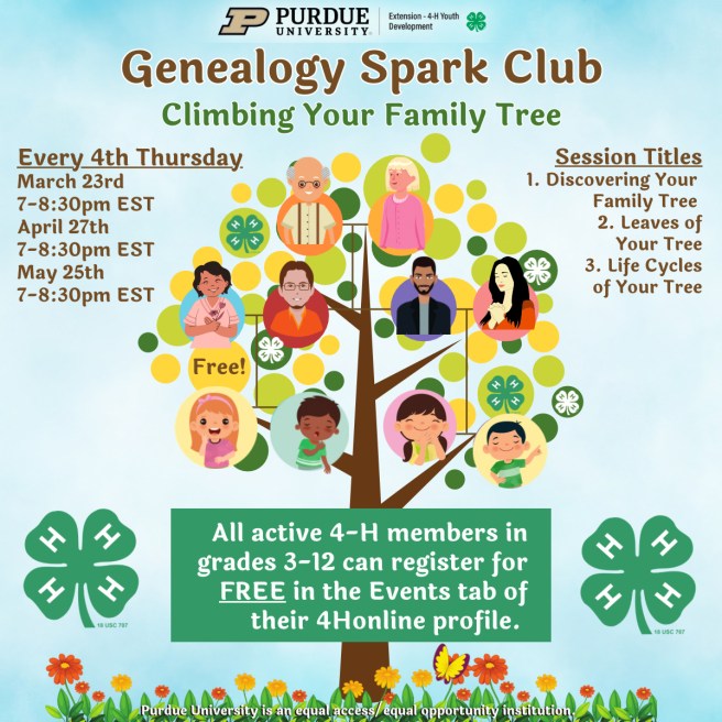 We’d like to help you SPARK an interest in exploring your very own family history! We have a free virtual club where you’ll learn about fascinating genealogy research methods as you construct family trees, charts, and reports for your 4-H Genealogy project! Embark on a journey of self-discovery that, with a little bit of work, will be a thrilling education into your own history. You’ll be the detective of your very own cold case as you learn the skills to go back through time and piece together the stories, places, and people that created YOU!