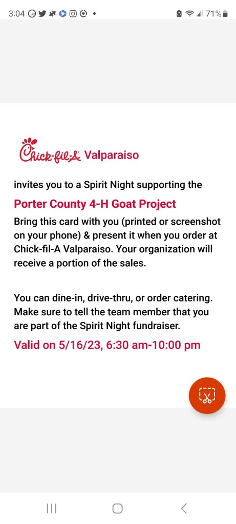 Fundraiser- Goat Project April 20, 2023 ~ portercounty4h Share this: Click to share on X (Opens in new window) X Click to share on Facebook (Opens in new window) Facebook Like Loading... Related