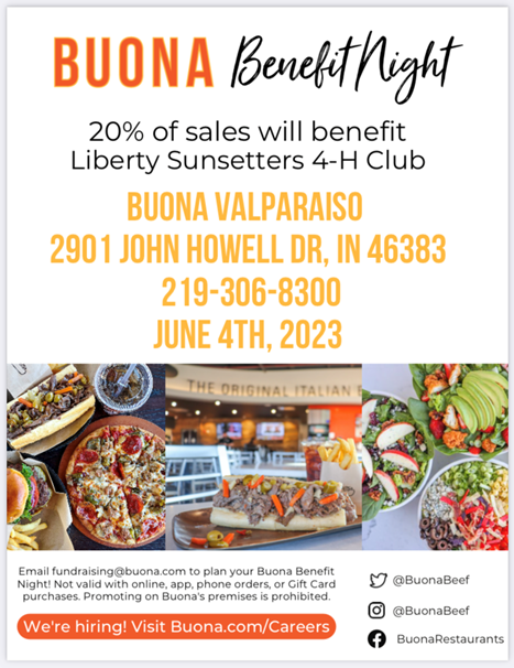 Liberty Sunsetters 4-H Club is having a Fundraiser at Buona, Valparaiso @ 2901 John Howell Dr. on June 4th, 2023 from 10:30 am to 10 :00 PM.
