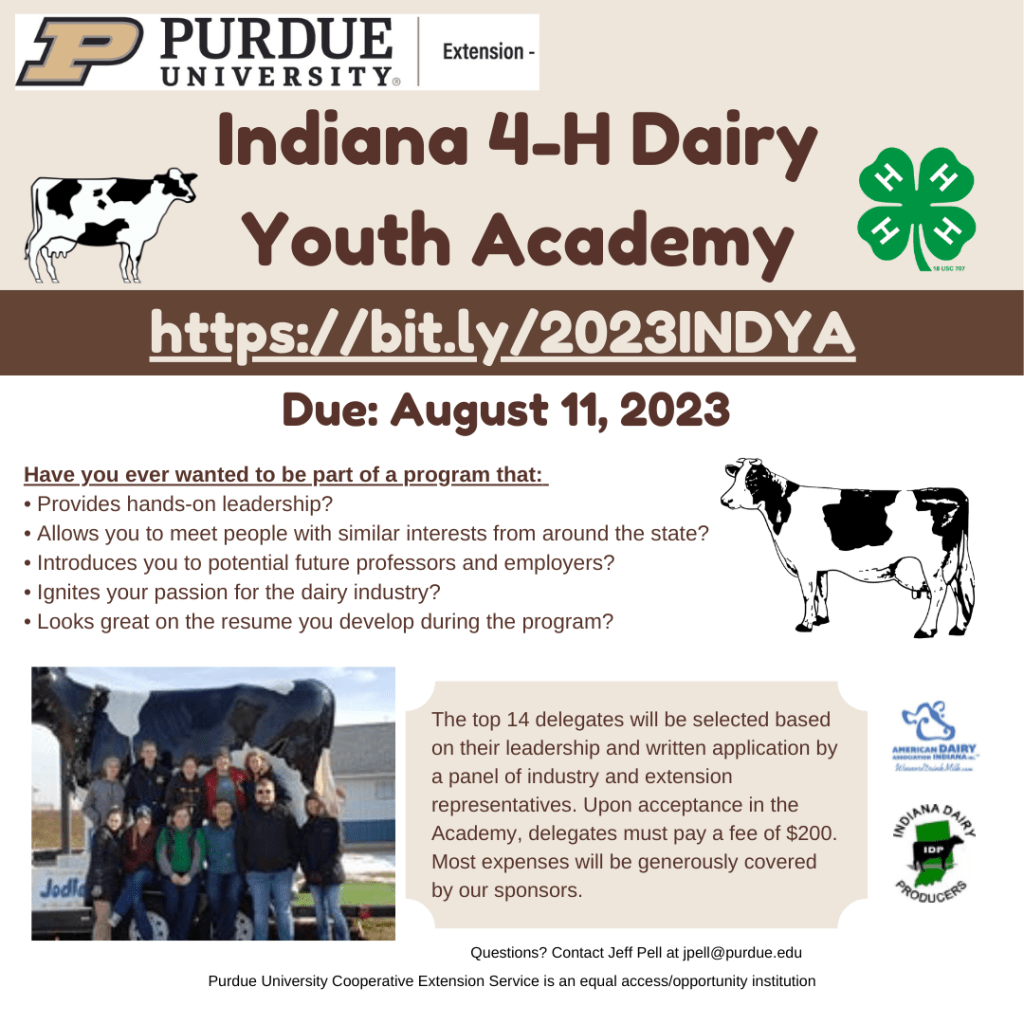 The Indiana 4-H Dairy Youth Academy is now accepting applications for this coming year! Applications are due August 11th. If you are interested in learning about the dairy industry though hands on experiences and activities, this opportunity is for you. The academy is open to 4-H Youth in grades 10-12 as of September 1st. Refer to the flyer and application for additional details. You can also find all the information about the Academy at https://bit.ly/2023INDYA.