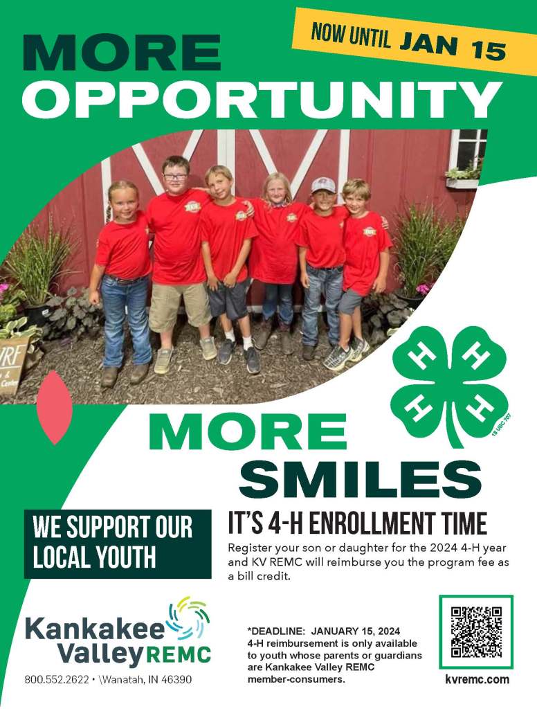 Kankakee Valley REMC is pleased to again offer assistance to Kankakee Valley REMC member-consumers who have children enrolled in 4-H. We are offering to reimburse families the program fees (state and county when applicable) for the 2024-2025 4-H year in the form of a bill credit.