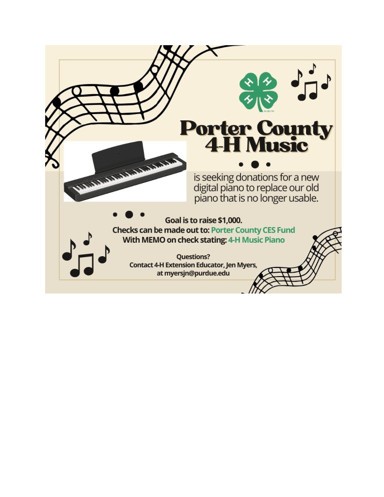 The Porter County 4-H Music Program is seeking donations to purchase a new digital piano for the program as our old piano is no longer usable.