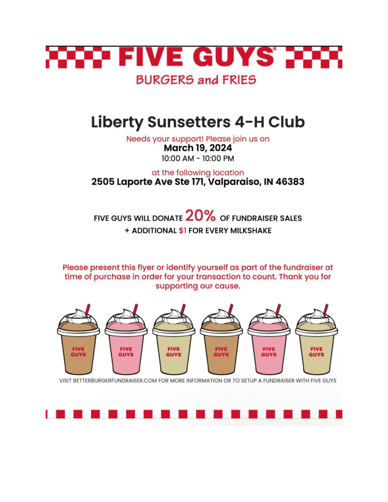Liberty Sunsetters Fundraiser- March 19 March 18, 2024 ~ portercounty4h Share this: Click to share on X (Opens in new window) X Click to share on Facebook (Opens in new window) Facebook Like Loading... Related
