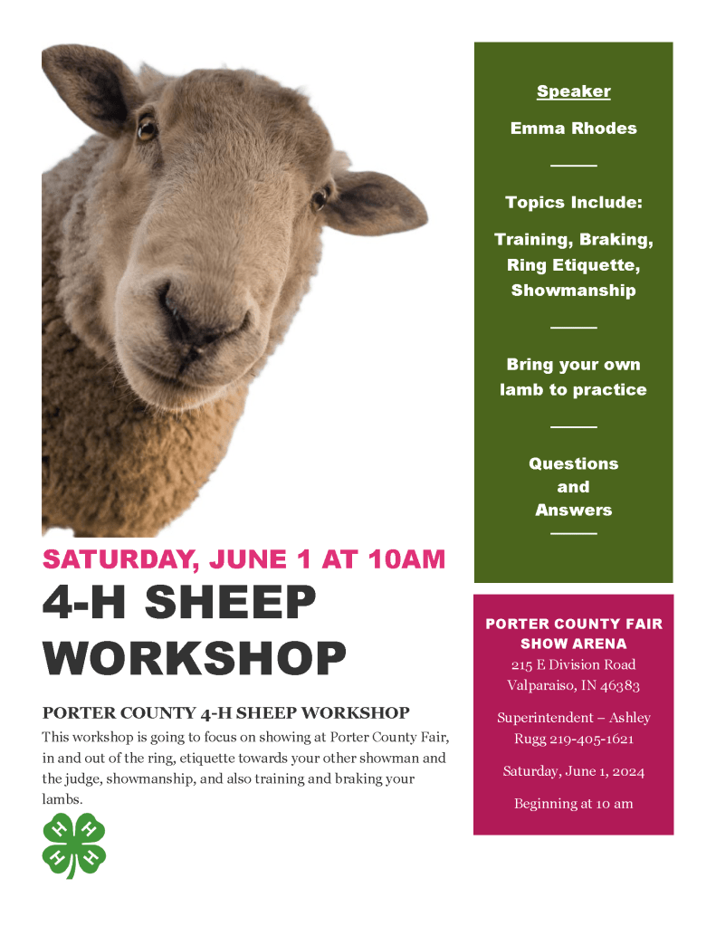 There will be a Sheep Workshop on Saturday, June 1 at 10:00 AM in the Show Arena at the Porter County Fairgrounds. This workshop is going to focus on showing at Porter County Fair, in and out of the ring, etiquette towards your other showman and the judge, showmanship, and also training and braking your lambs.