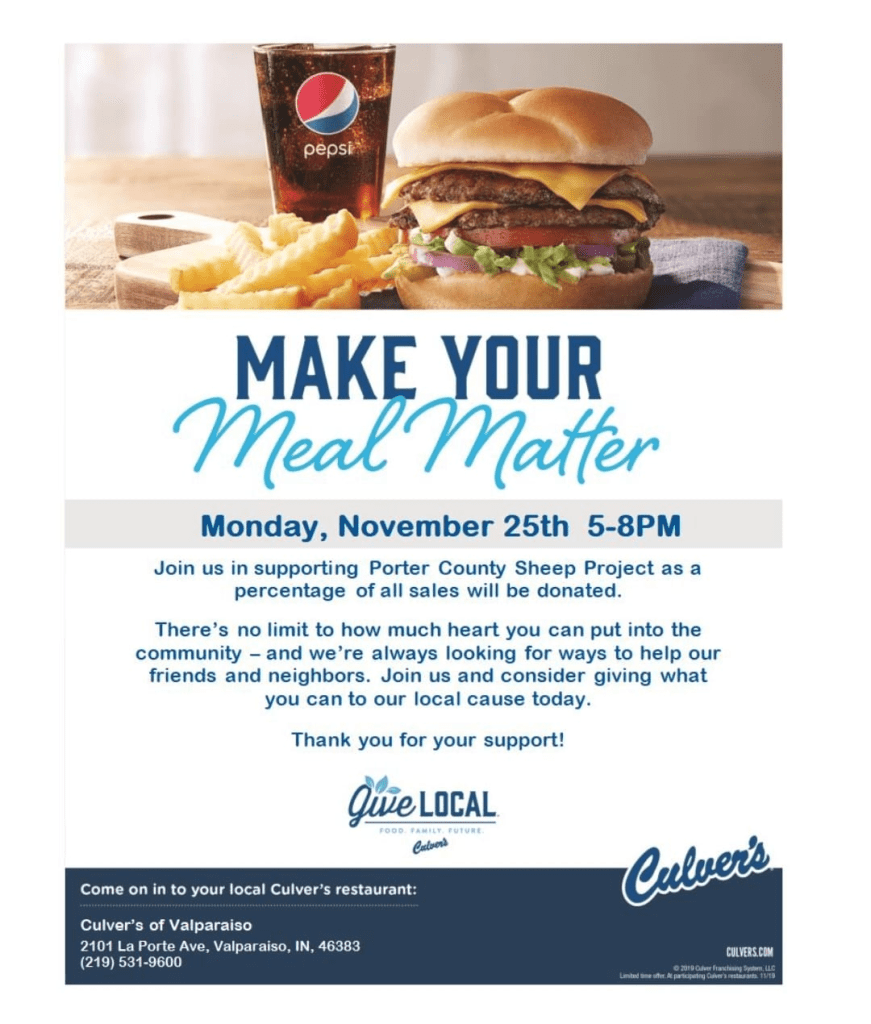 The Porter County 4-H Sheep kids will be hosting their annual fundraiser at the Valpo Culver’s between the hours of 5 pm – 8 pm. Please come support these hardworking kids and catch a glimpse of them working along side the Culver’s employees!!