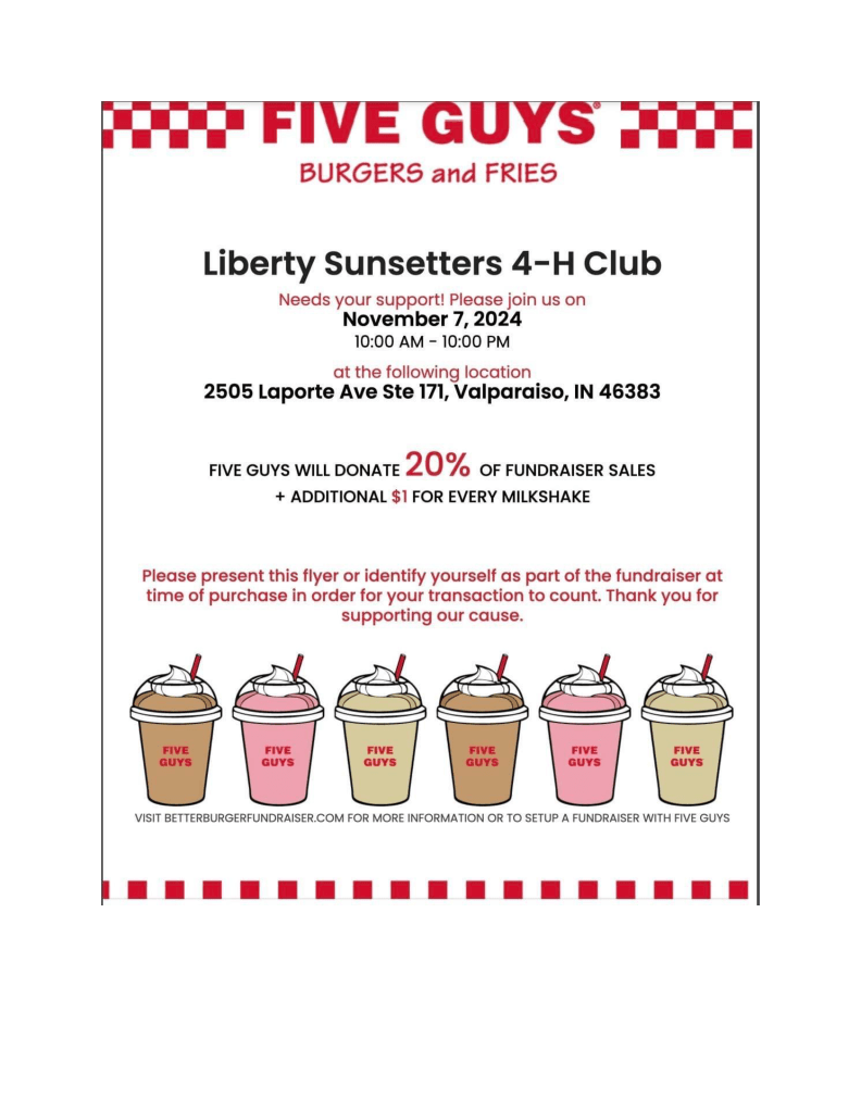 Liberty Sunsetter’s Fundraiser November 7, 2024 ~ portercounty4h Support Liberty Sunsetters by attending their fundraiser today! Share this: Click to share on X (Opens in new window) X Click to share on Facebook (Opens in new window) Facebook Like Loading... Related