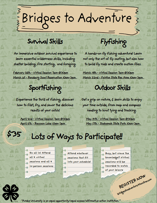 Explore the outdoors, experience the thrill of flyfishing, learn essential wilderness skills and so much more in Indiana 4-H’s Bridges to Adventure SPARK Club! This will be a wildly awesome adventure that you won’t want to miss!