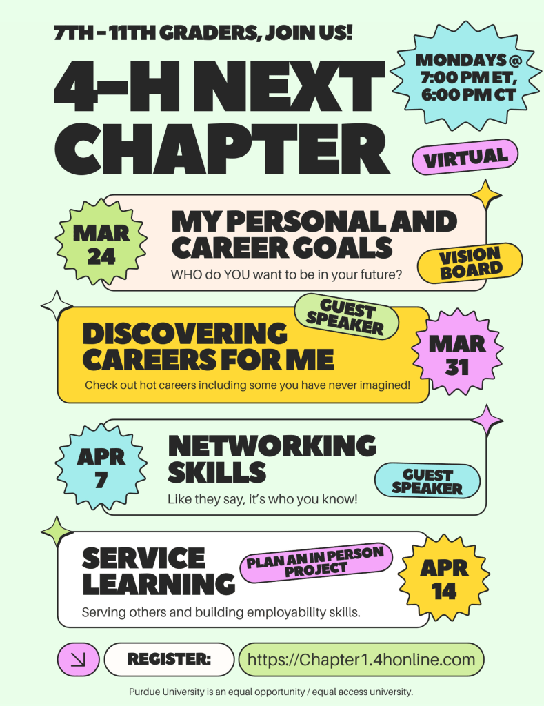 Next Chapter programming is available to all 7th through 11th grade youth in Indiana via virtual programming beginning March 24. Youth do not have to be enrolled 4-H members but do need to register and choose the “participant” role at https://Chapter1.4honline.com These four Mondays represent Chapter 1 of the curriculum. Remaining Chapters will be available in the future.