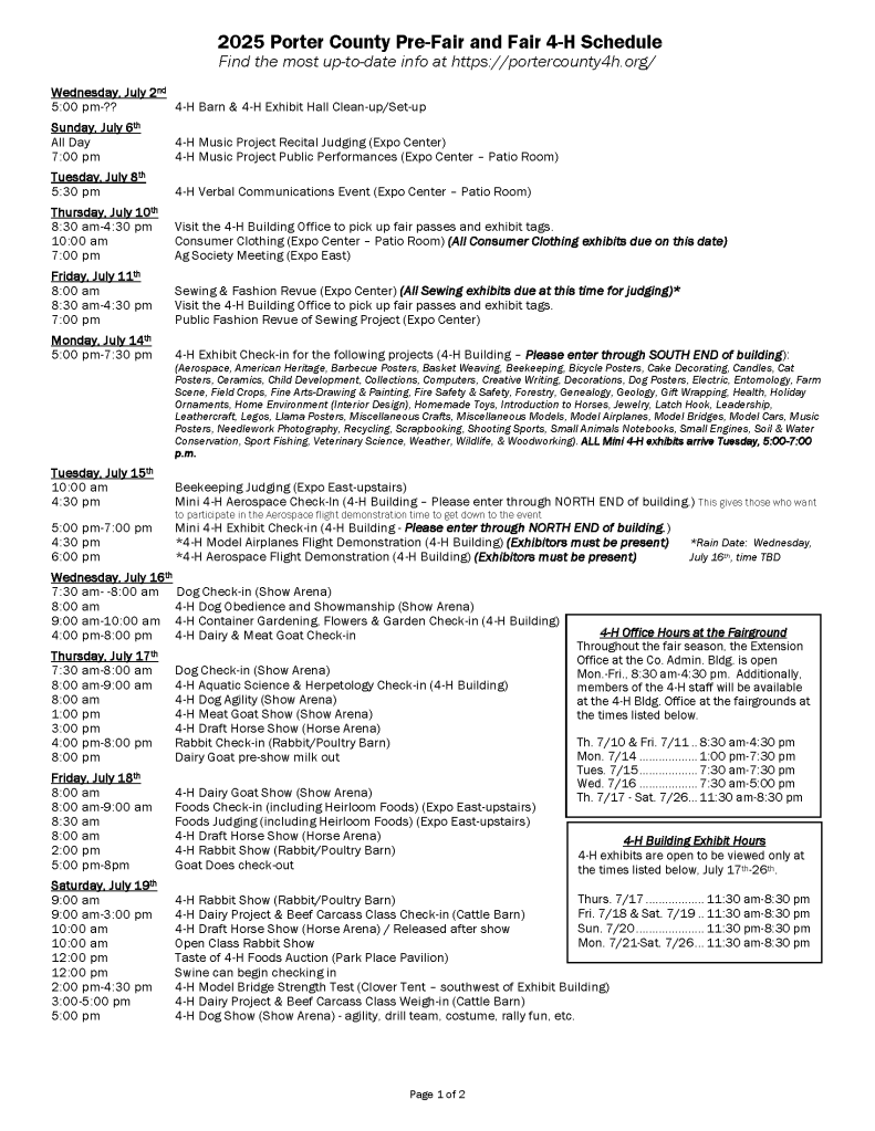 2025 Porter County Pre-Fair and Fair 4-H Schedule June 12, 2025June 24, 2025 ~ portercounty4h Share this: Click to share on X (Opens in new window) X Click to share on Facebook (Opens in new window) Facebook Like Loading... Related