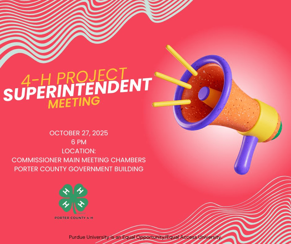 There will be a meeting taking place on October 27th starting at 6 pm here in the Porter County Government Building where we will discuss Indiana 4-H updates as well as county program updates.