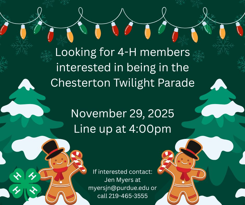 Looking for interested 4-H’ers to be in the Chesterton Twilight Parade to represent 4-H. If you have interest, contact our 4-H Educator for more information.