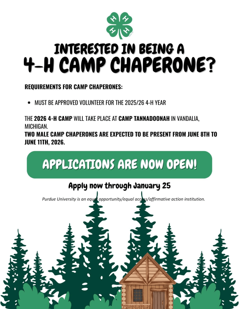Interested in Being a 4-H Adult Camp Chaperone? November 21, 2025 ~ portercounty4h We still need adult chaperones! Join us at 4-H Summer Camp Tannadoonah, June 8–11, 2026. Help campers explore, grow, and have fun in a safe and supportive environment. Share this: Click to share on X (Opens in new window) X Click to share on Facebook (Opens in new window) Facebook Like Loading... Related
