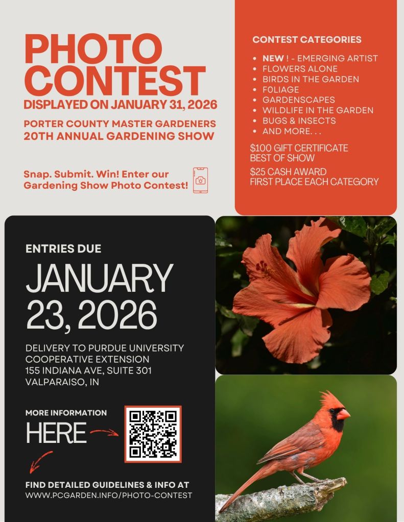 This year, and for the first time, our Porter County Master Gardener Association, is opening our Photography Contest at our annual Gardening Show to include a new category that will award “Emerging Artists.” Our Gardening Show will take place at the Porter County Expo Center on Saturday, January 31st, 2026.