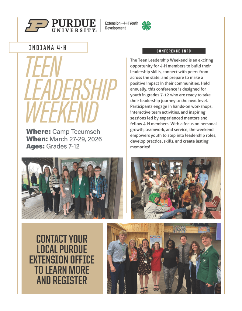 Registration is officially open for the 2026 Teen Leadership Weekend! This trip is an opportunity extended to youth in grades 7-12. Teen Leadership Weekend will take place March 27-29 at Camp Tecumseh in Brookston, Indiana. Due to the generosity of the Indiana 4-H Foundation, the cost to attend this amazing experience is only $50.