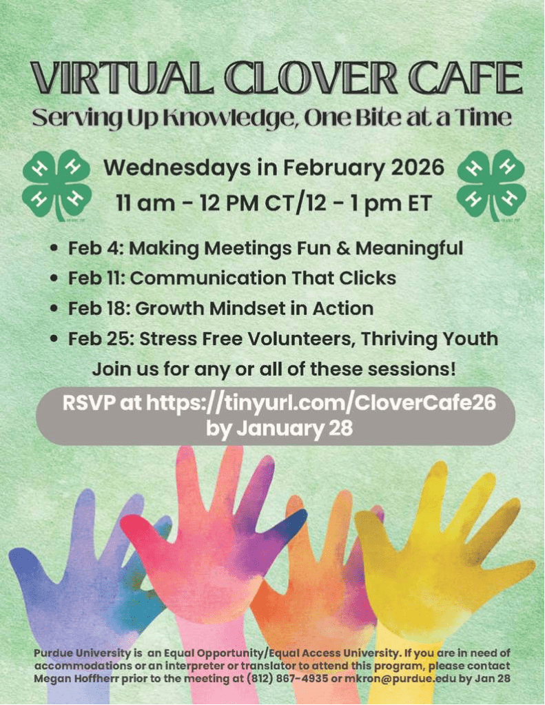 The following program is for Volunteers who feel like they would like to improve their skills in the following areas. Take a look at the topics and register at the link provided: https://tinyurl.com/CloverCafe26