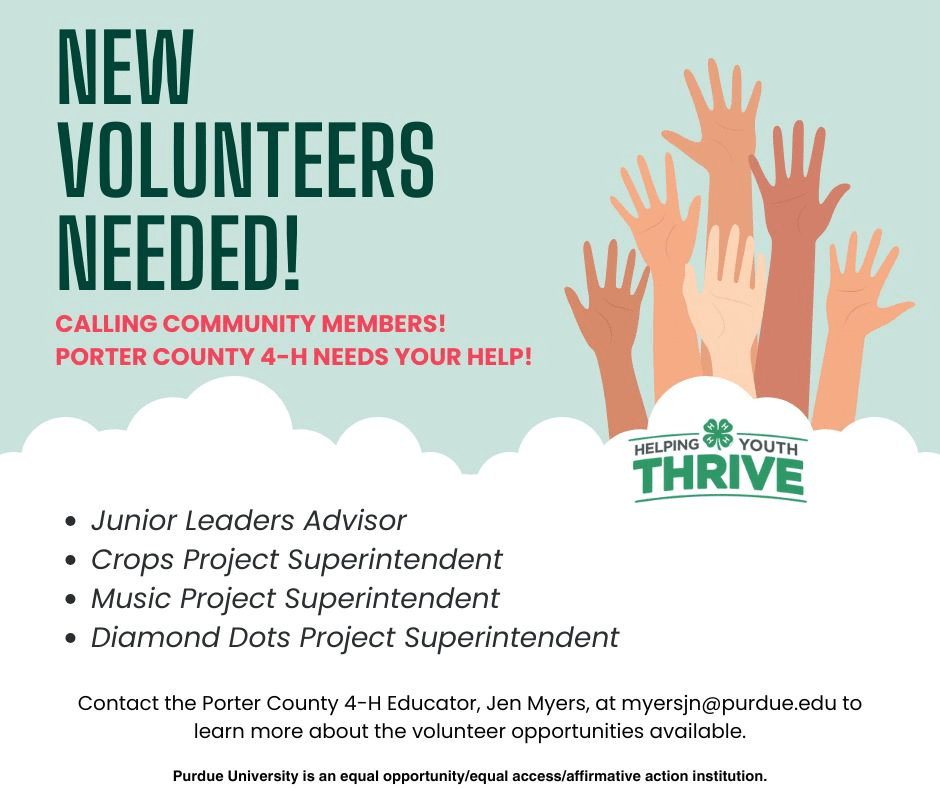 Contact our 4-H educator for more details by email at myersjn@purdue.edu
