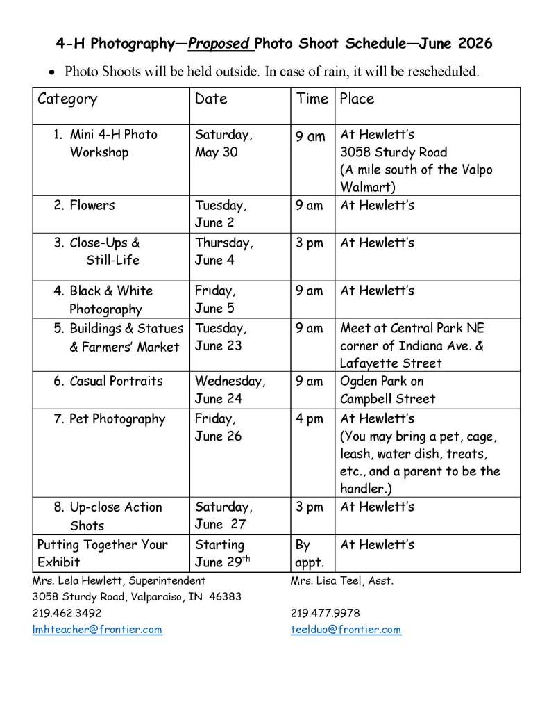 Here are the dates for Photography Workshops. Contact information is below for questions concerning these dates and general photography questions.