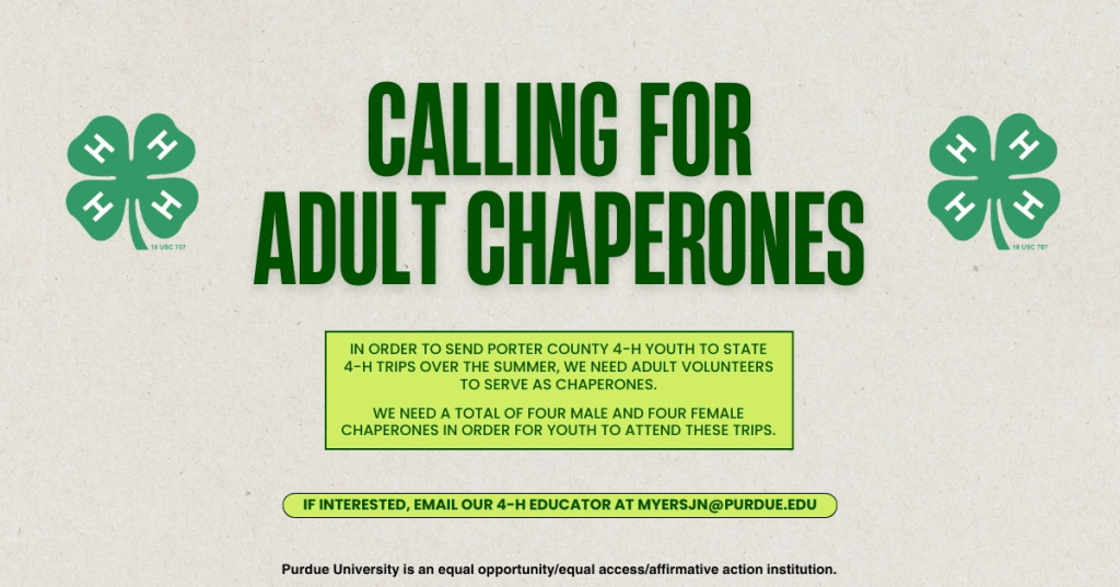 Porter County 4-H is searching for adult volunteers to serve as chaperones for 4-H Academy and 4-H Round Up at Purdue University this summer. We must have chaperones in order for youth to attend as our 4-H Educator is unable to attend the trip due to 4-H Camp being at the same time.
