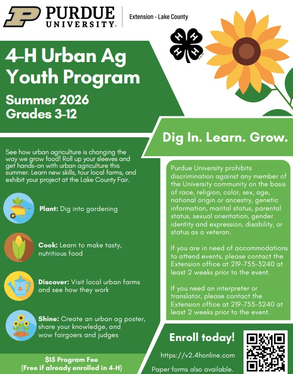 Purdue Extension-Lake County 4-H is excited to offer a summer program for young people in grades 3-12 to expand in urban ag.