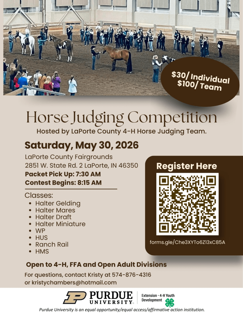 Horse Judging Competition April 10, 2026 ~ portercounty4h LaPorte County 4-H Horse Judging Competition Share this: Share on X (Opens in new window) X Share on Facebook (Opens in new window) Facebook Like Loading... Related